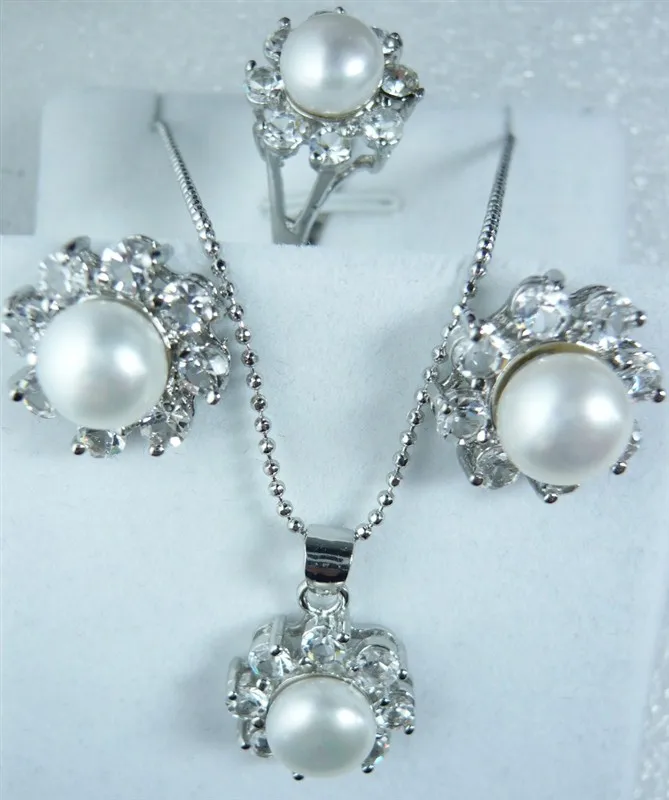 Black South sea Shell Pearl Earrings Ring & Necklace Pendant Set Silver hook wholesale women's jewe