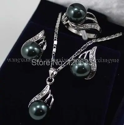 BEST QUALITY Black South sea Shell Pearl Earrings Ring & Necklace Pendant Set Silver hook wholesale women's jewe